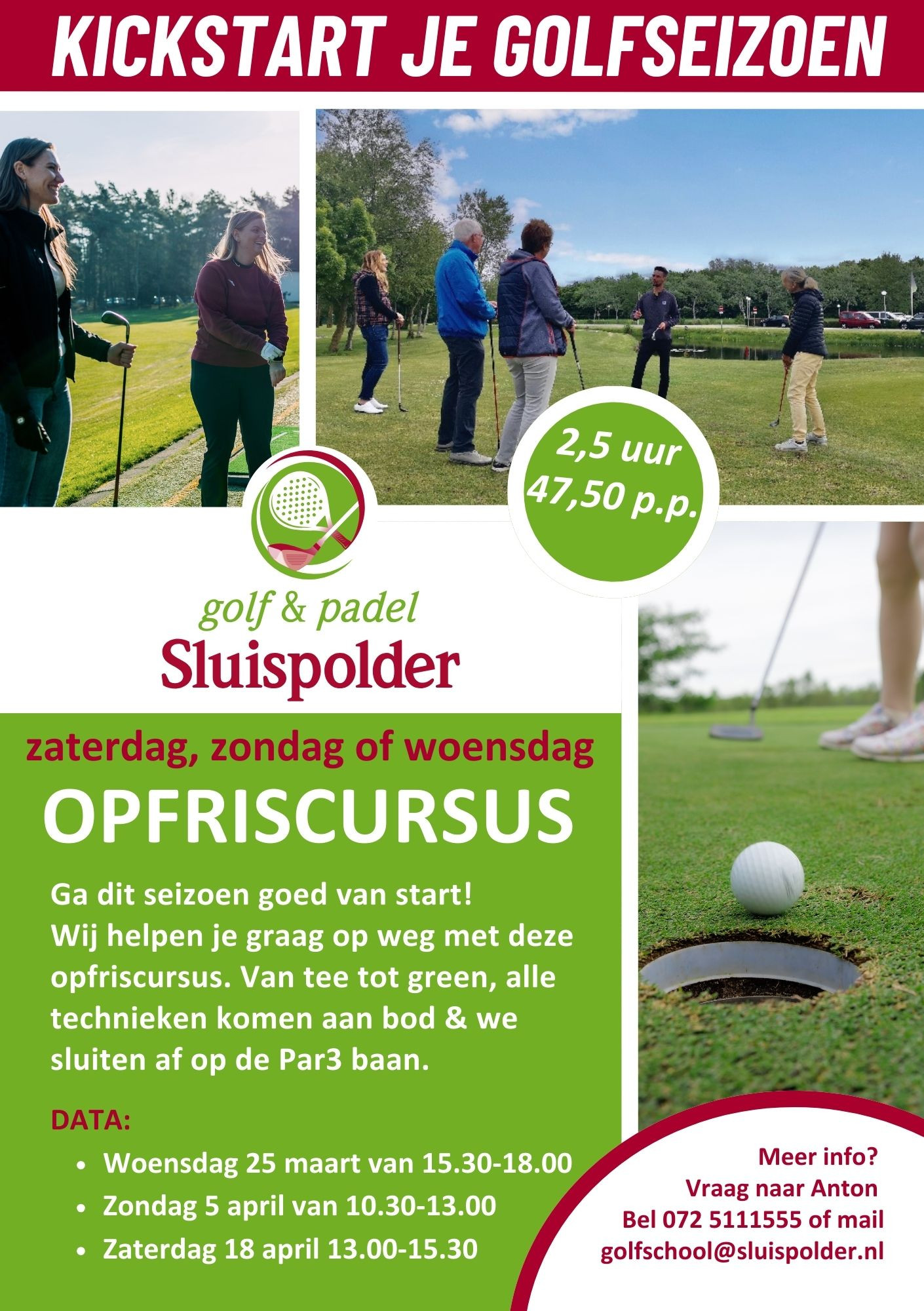 Meer info? Vraag naar Anton, bel 072 5111555 of mail golfschool@sluispolder.nl