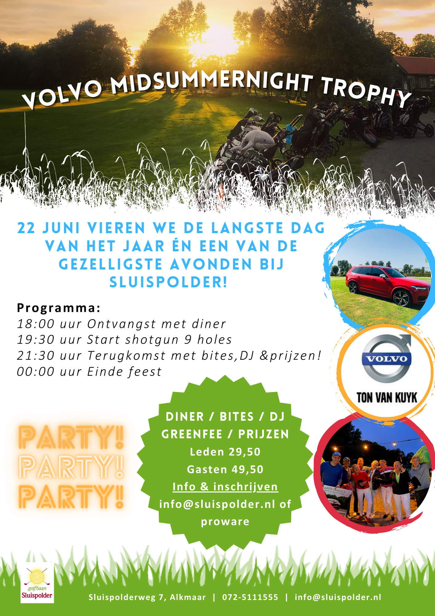 Eerst lekker eten, dan swingen op de baan tijdens een 9 holes shotgun & aansluitend dansen met Volvo en golf & padel Sluispolder. Bij terugkomst staat de DJ klaar tijdens een zwoele avond om het echt donker te zien worden...
