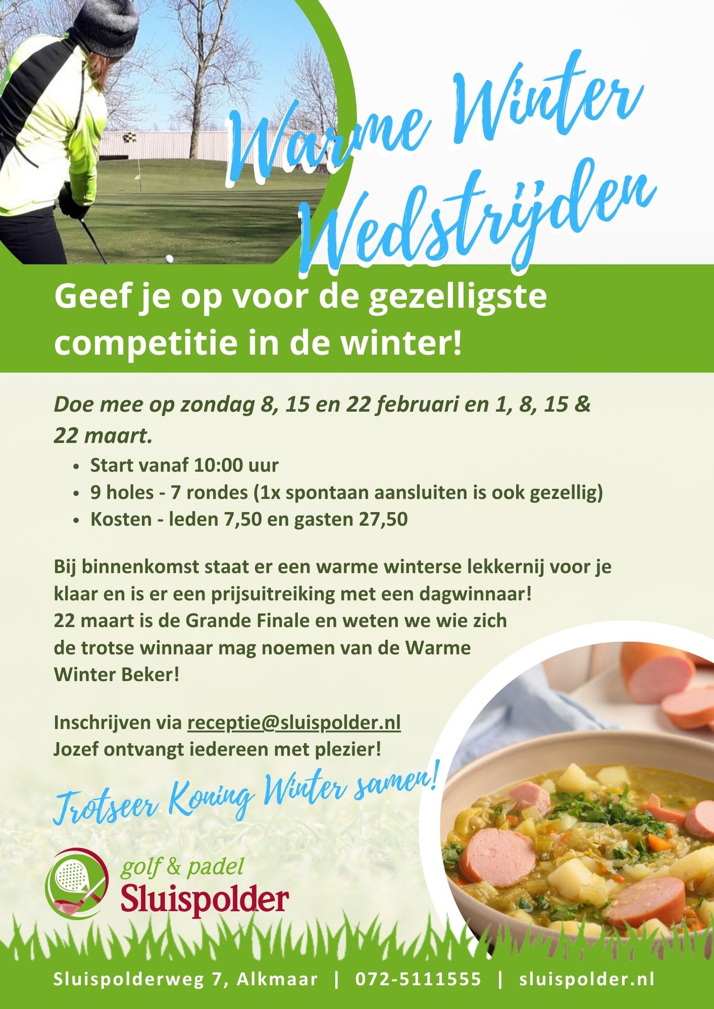 Dé manier om met elkaar Koning Winter te trotseren! Inschrijven via receptie@sluispolder.nl - of de Intogolf App. Jozef ontvangt iedereen met plezier!